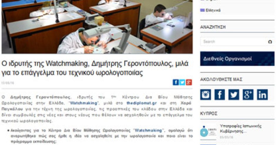Ο Δημήτρης Γεροντόπουλος, ιδρυτής του 1ου Κέντρου Δια Βίου Μάθησης Ωρολογοποιίας στην Ελλάδα, “Watchmaking”, μιλά στο thediplomat.gr και στη Χαρά Παγκάλου για την τέχνη της ωρολογοποιίας, τις προοπτικές του κλάδου στην Ελλάδα και δίνει συμβουλές στις νέες και στους νέους που θέλουν να ασχοληθούν με το επάγγελμα του τεχνικού ωρολογοποιίας.