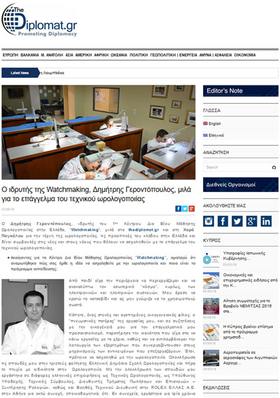 Ο Δημήτρης Γεροντόπουλος, ιδρυτής του 1ου Κέντρου Δια Βίου Μάθησης Ωρολογοποιίας στην Ελλάδα, “Watchmaking”, μιλά στο thediplomat.gr και στη Χαρά Παγκάλου για την τέχνη της ωρολογοποιίας, τις προοπτικές του κλάδου στην Ελλάδα και δίνει συμβουλές στις νέες και στους νέους που θέλουν να ασχοληθούν με το επάγγελμα του τεχνικού ωρολογοποιίας.